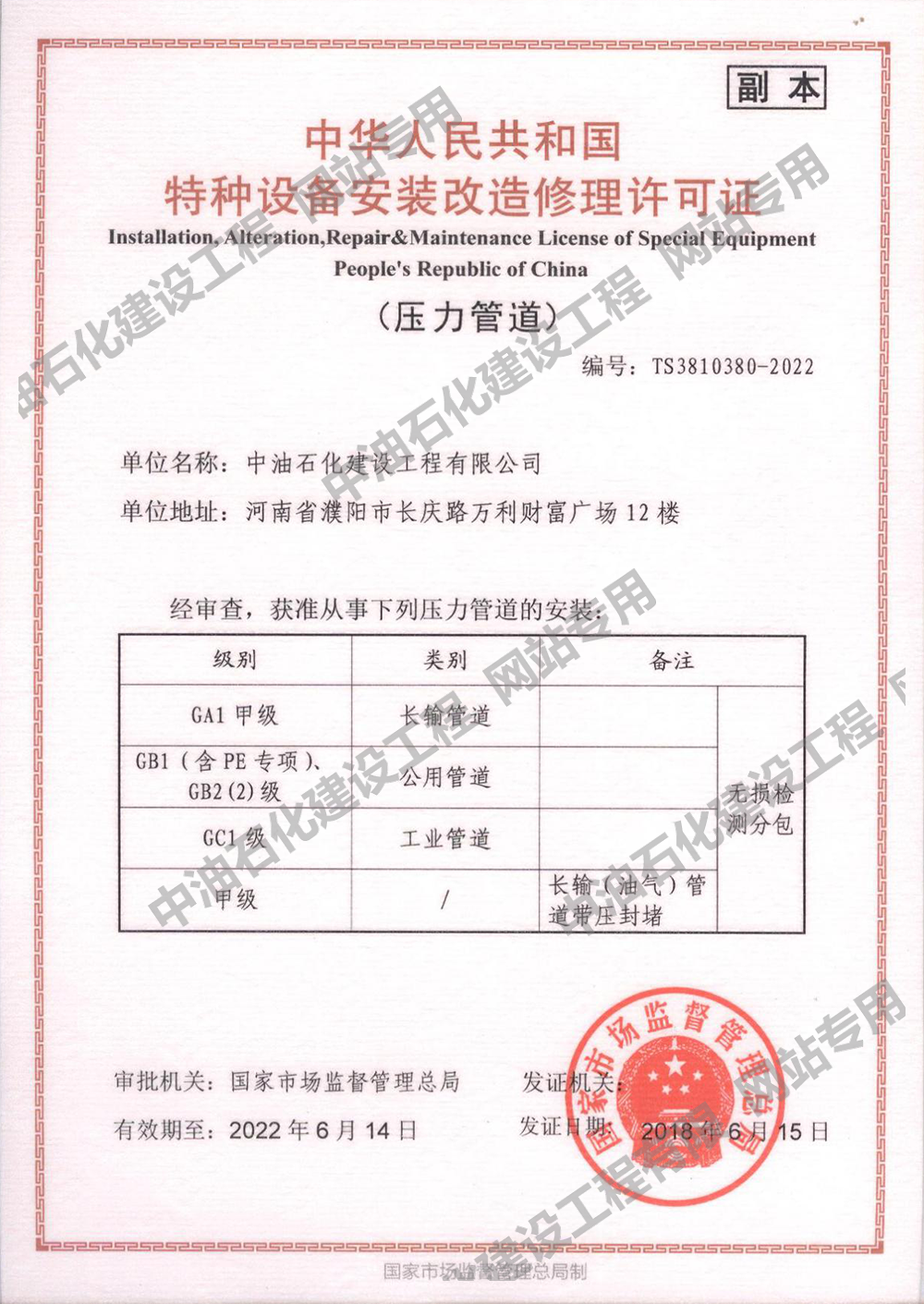 中油石化建設(shè)工程有限公司(CPPC)成立于2001年8月,公司現(xiàn)注冊(cè)資金1.1268億元。 經(jīng)過(guò)20年的發(fā)展,CPPC形成了以石油化工安裝工程、長(zhǎng)輸管道工程、市政工程、鋼結(jié)構(gòu)制安為四大核心業(yè)務(wù),以管道技術(shù)服務(wù)、送變電工程、消防工程、維保-搶險(xiǎn)-投產(chǎn)保運(yùn)為四大輔助配套業(yè)務(wù)的核心技術(shù)品牌,具備PC總承包能力和EPCC總承包能力。至2022年,公司具有施工總承包資質(zhì)5項(xiàng),施工專(zhuān)業(yè)承包資質(zhì)4項(xiàng),不分等級(jí)2項(xiàng);特種設(shè)備壓力安裝改造維修許可證,承裝承修電力,中國(guó)工業(yè)清洗企業(yè)物理、化學(xué)清洗A級(jí)資質(zhì)等。 公司成立20多年來(lái),累計(jì)完成場(chǎng)站建設(shè)557座,管道施工6000多公里,輸電線(xiàn)路施工3700公里,電力電纜施工8000多公里,建筑施工950余萬(wàn)平方米,年?duì)I業(yè)能力超過(guò)15 億元。